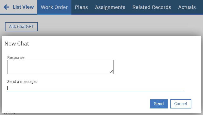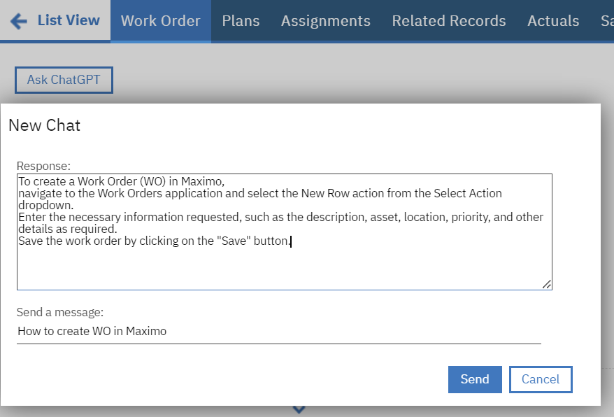 To Integrate ChatGPT with Maximo, we will have to create a button like “Ask ChatGPT“ in the below image that will open a dialog box “New Chat“. The dialog box will contain a text field for user input, a multi-line text box for response and a send message button. At the click of the send button, the automation script will run, which will call the OpenAI API and retrieve the response.